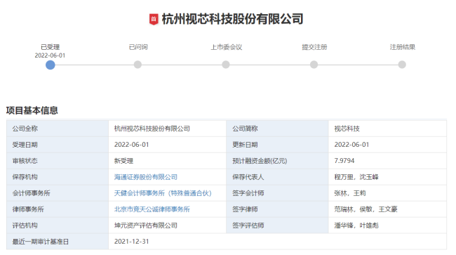 6月1日,深圳证券交易所正式受理了杭州视芯科技股份有限公司(以下简称“视芯科技”)创业板上市申请。
