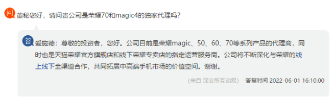 在与荣耀合作方面,爱施德指出,公司目前是荣耀magic、50、60、70等系列产品的代理商,同时也是天猫荣耀官方旗舰店和线下荣耀专卖店的指定运营服务商。公司将不断深化与荣耀的线上线下全渠道合作,共同拓展中高端手机市场的价值空间。