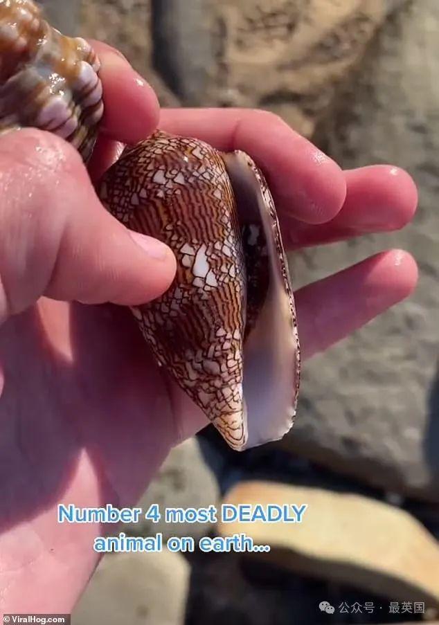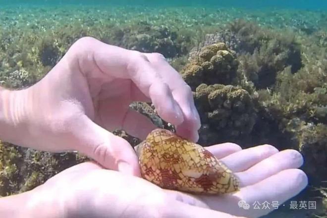 这是因为,他手中的并非普通的贝壳,而是一个伪装的致命捕食者—— 一只纺织芋螺,这种看似无害的生物体内含有的毒性,足以“秒杀”一个成年人。