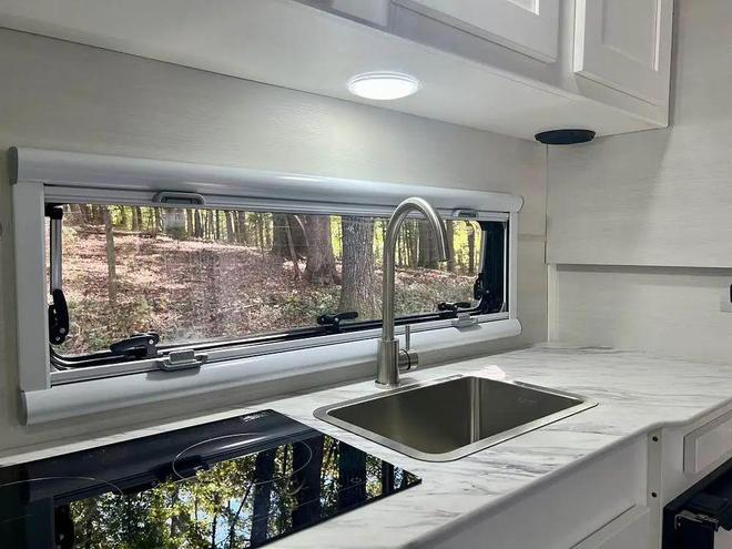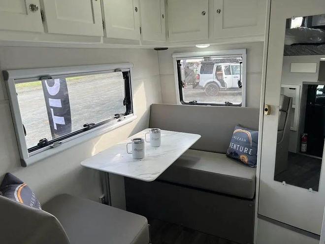 厨房区台面非常宽裕,内部配备洗手池、电磁炉、冰箱、微波炉等。电路方面,400Ah锂电+2000W逆变器+400W太阳能板将为生活区提供电能。如有需要,用户还可以额外加装一块400Ah锂电、200W太阳能板以及功率更大的逆变器组合。现目前新车起售价为17.9万美元,约合人民币129.54万元。