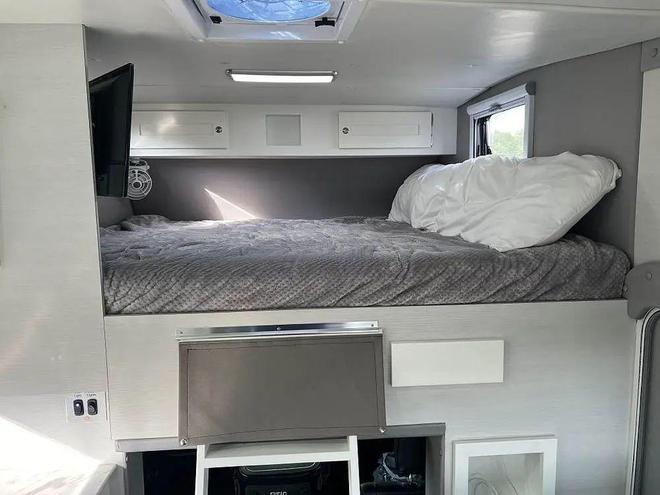 额头床尺寸是2012x1737(mm)的双人床铺,前方设计有储物格,两侧开设侧窗,顶部还有一台双向换气扇。